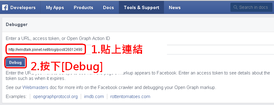 首先連到臉書的Degugger頁面 https://developers.facebook.com/tools/debug/